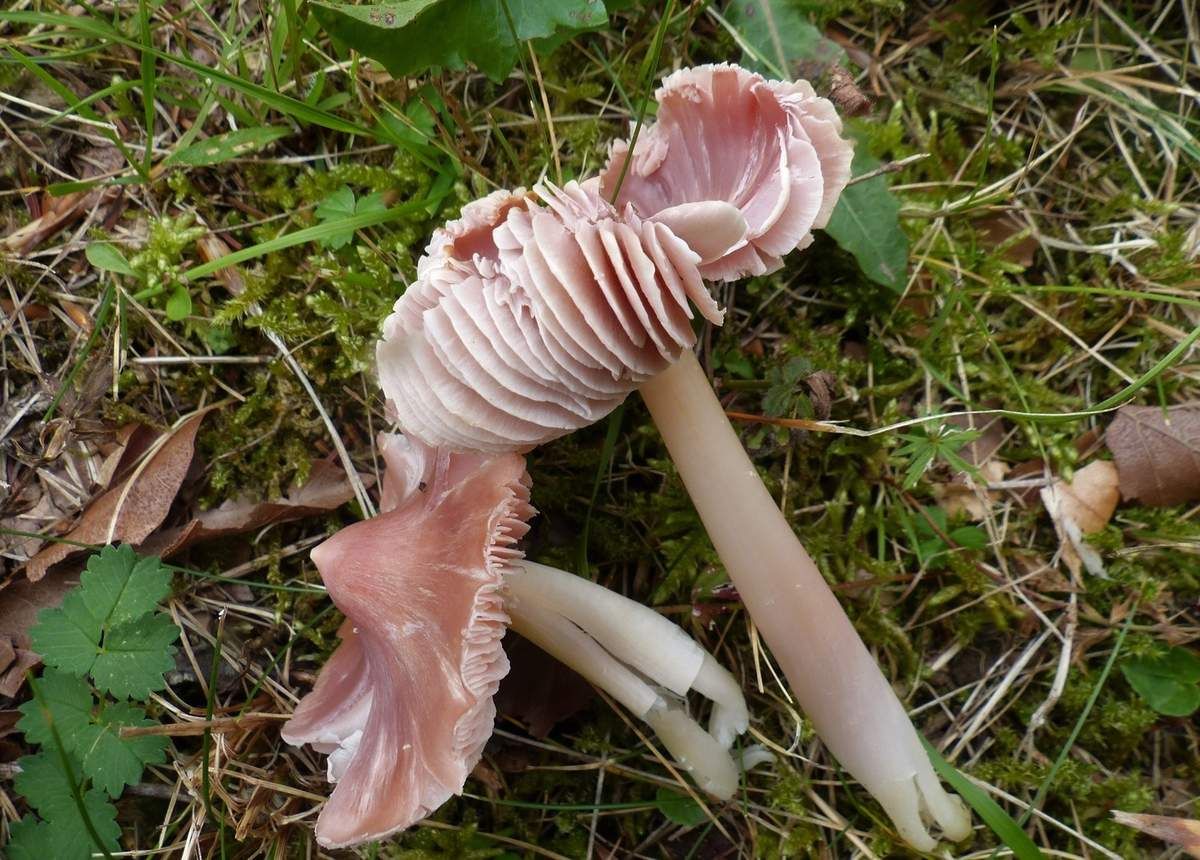 Le long d’une lisière, nous avons trouvé une vingtaine d’espèces différentes, russules, lactaires, bolets, amanites … Et, cachés dans l’herbe, deux hygrophores de couleur rose…. Une espèce que nous n’avions jamais vue, mais tellement caractéristique que nous avons vite ouvert notre petite bible portative, le Bon.